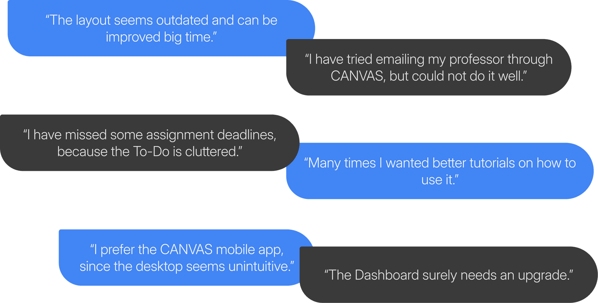 The Canvas app covers a lot, so we focused our redesign on three key tasks. These issues were most frequently reported in user feedback and were also the most significant pain points for students.