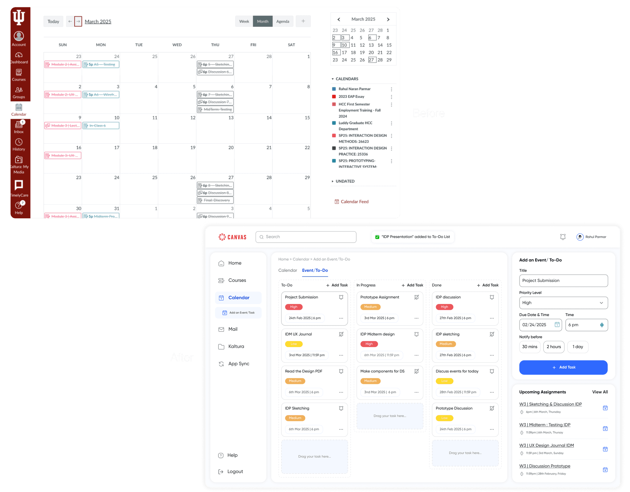 We streamlined task management by allowing students to add assignments directly to their To-Do list via the calendar icon. With just a few clicks, users could set reminders, choose priority levels, and customize notifications. This makes the To-Do feature more accessible, actionable, and integrated into their workflow.