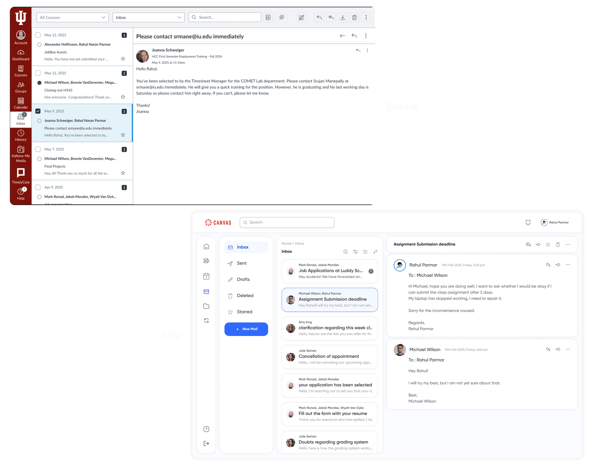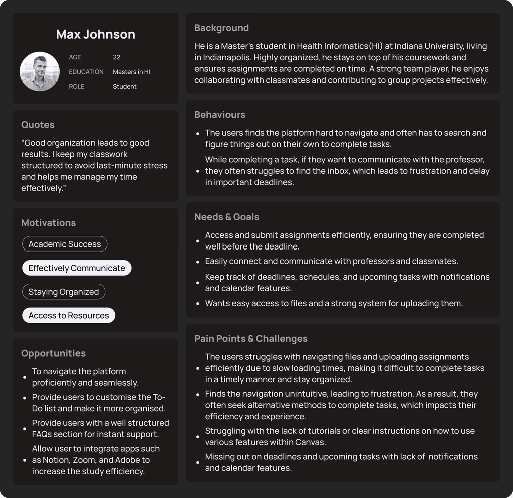 Students struggled to navigate Canvas due to inconsistent layouts and content redundancy, leading to confusion, missed submissions, and a disrupted learning experience.